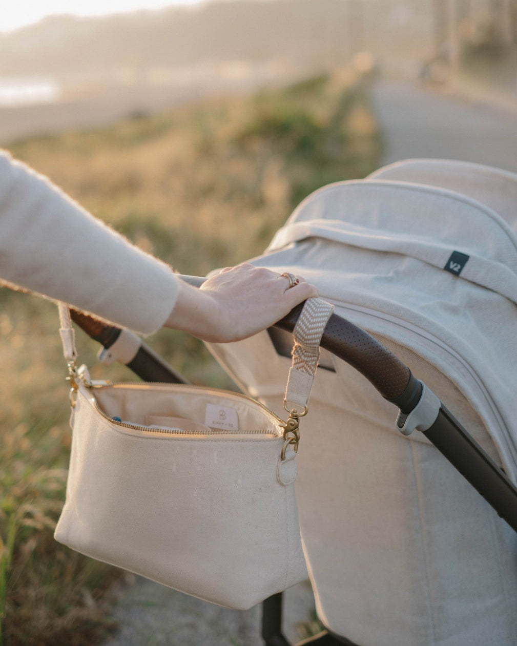 Designed to move with you, The Carryall transitions from stroller straps to an elevated crossbody – transforming from stroller organizer to a tote for on the go.